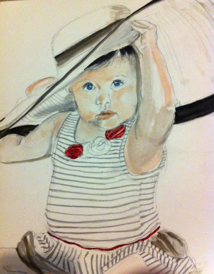 A watercolor depiction of a little girl with a summer hat on.