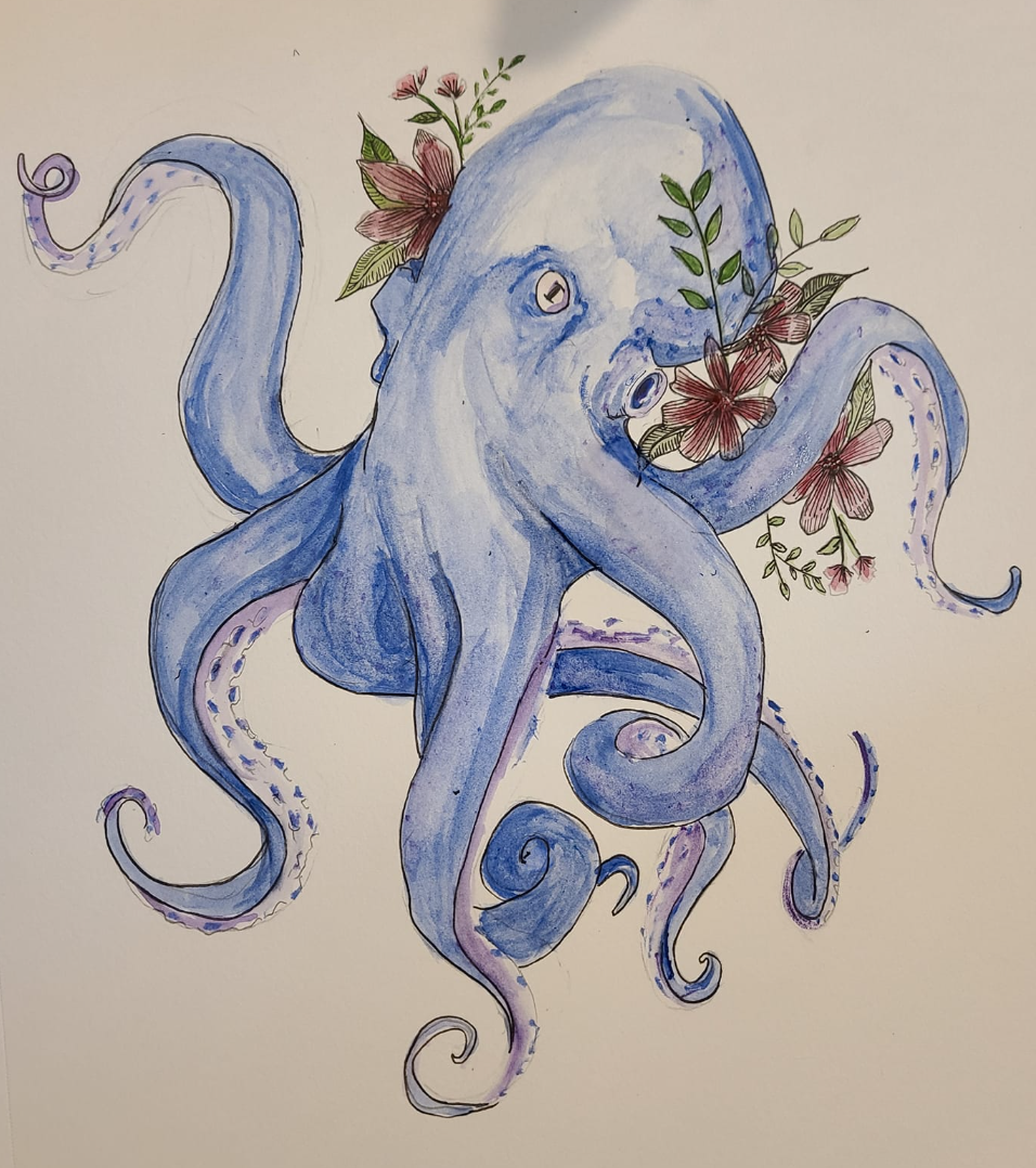 Watercolor rendering of an octopus and floral design.